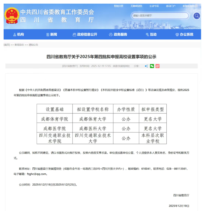 12月19日,四川省教育厅发布了“四川省骄教育厅关于2025年第四批拟申报高校设置事项的公示”。