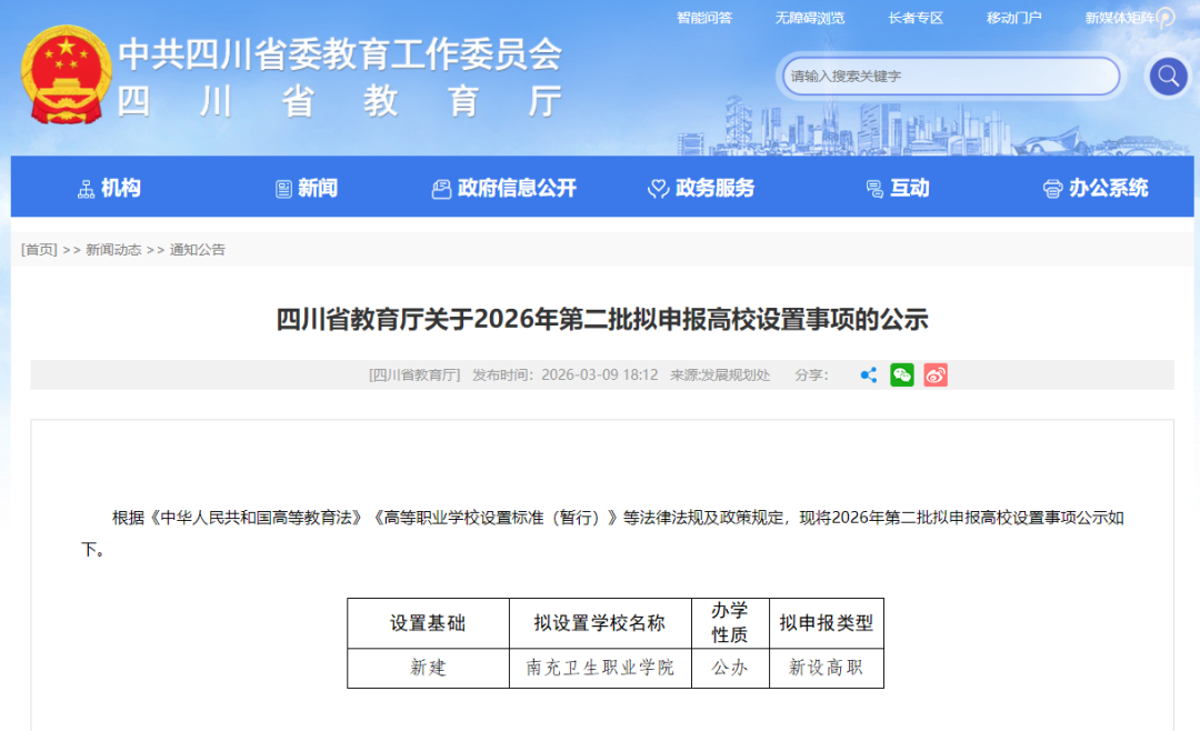 《2026年南充市人民政府工作报告》指出,2026年将实现南充卫生职业学院首期招生。