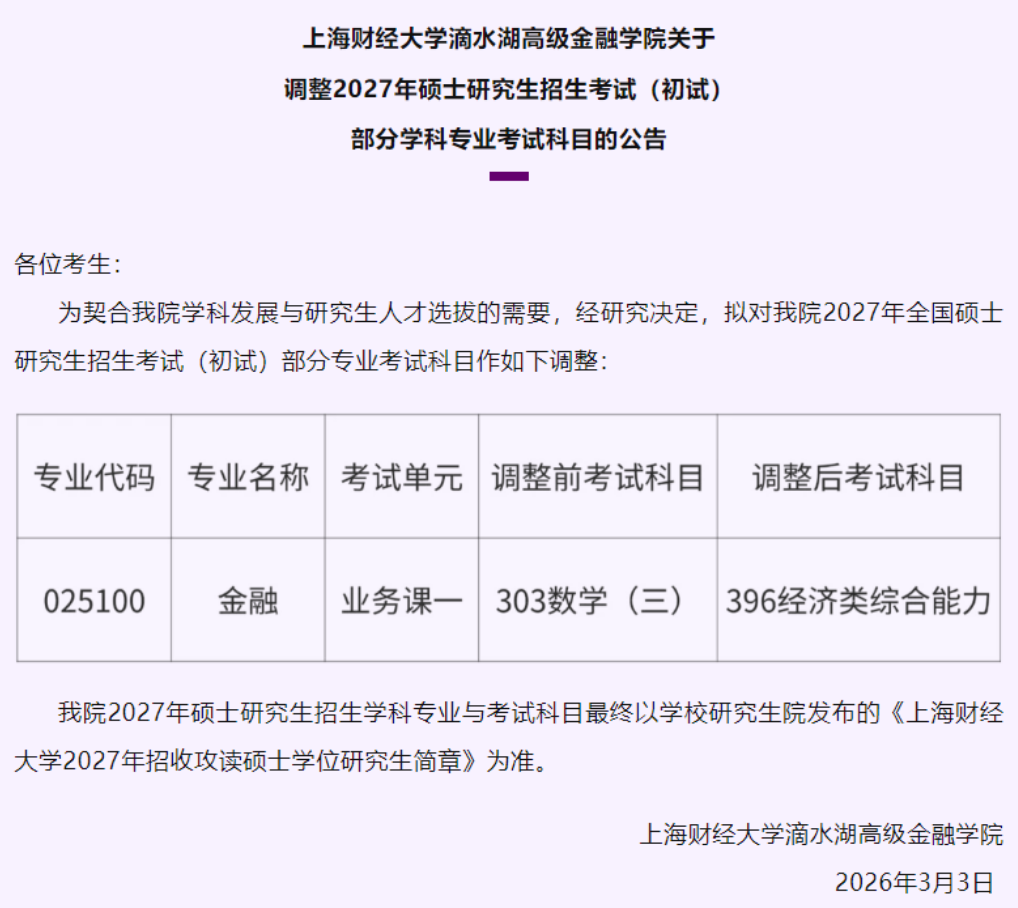 自3月3日起,该校金融学院、数字经济学院、财税投资学院、滴水湖高级金融学院及首席经济学家中心陆续发布通知:27届考研起,相关专业初试科目业务课一由303数学(三)调整为396经济类综合能力,涵盖金融等多个热门专硕专业。
