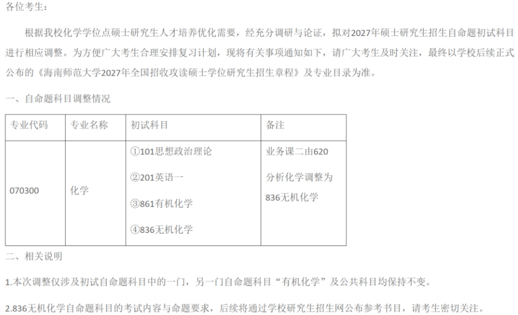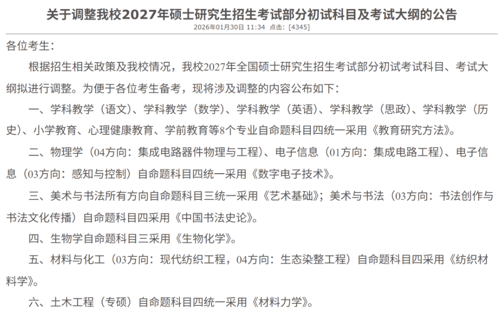 该校发布2027年硕士研究生招生考试公告,对部分初试科目及考试大纲进行统一调整: