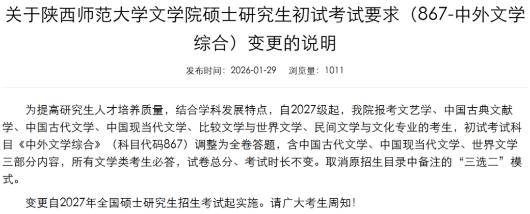 2027级起,文艺学、中国古代文学等所有文学类专业的《中外文学综合》(867)考试形式调整,取消原“三选二”答题模式,改为全卷答题,需完成中国古代文学、中国现当代文学、世界文学三部分内容作答,试卷总分与考试时长不变。