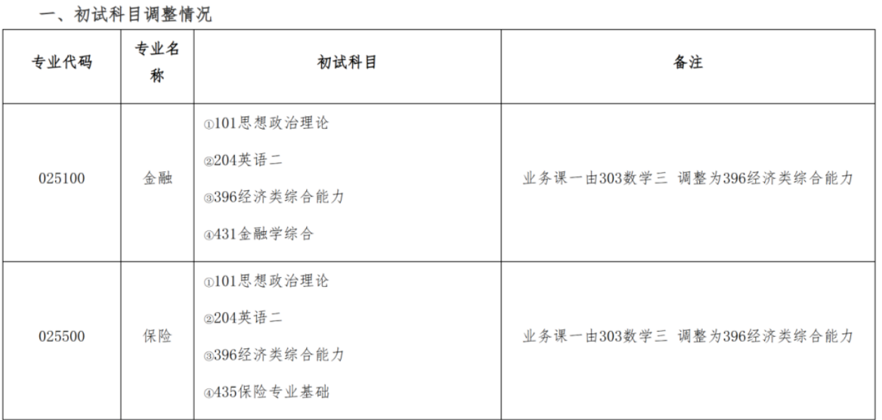 2027年金融硕士(025100)、保险硕士(025500)初试业务课一调整,由303数学三改为396经济类综合能力,其余考试科目保持不变,396科目参照全国统一考试规定执行。