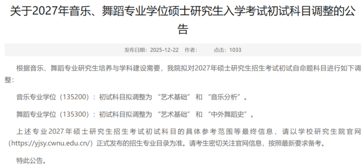 音乐、舞蹈专业学位硕士初试自命题科目全面调整:音乐专业学位(135200)考艺术基础+音乐分析;舞蹈专业学位(135300)考艺术基础+中外舞蹈史,具体参考范围以院校后续发布的招生专业目录为准。