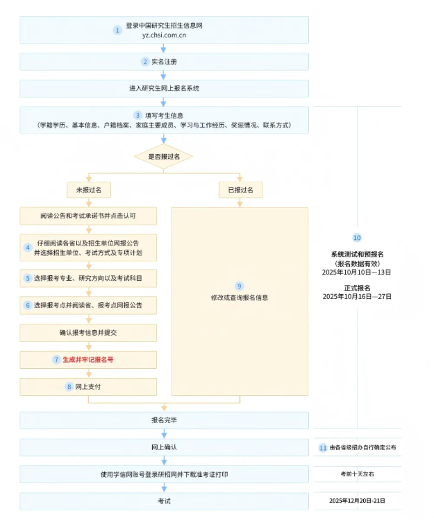 (1)登录研招网。考生应在规定时间登录“中国研究生招生信息网”(网址:https://yz.chsi.com.cn)认真阅读2026年全国硕士研究生招生考试报名公告和报名须知,按省级教育招生考试机构、报考点以及招生单位的网报公告要求参加网上报名和网上确认,并按规定缴纳报考费。
