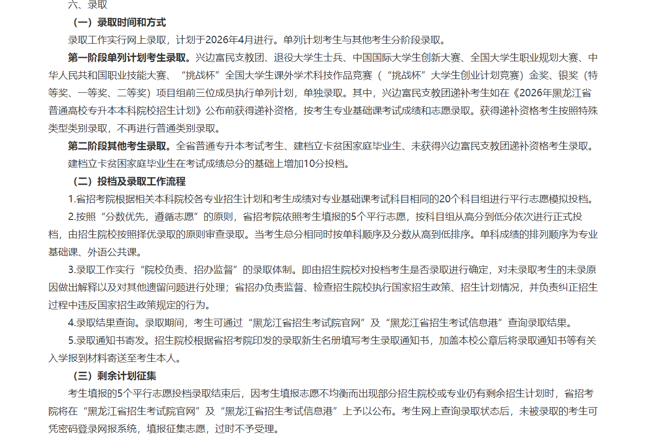 根据黑龙江省招生考试院2025年11月13日发布的《2026年黑龙江省普通高等学校专升本考试招生实施办法》中,提到录取时间和方式有几点需要注意的地方,具体的内容可以查看下面内容