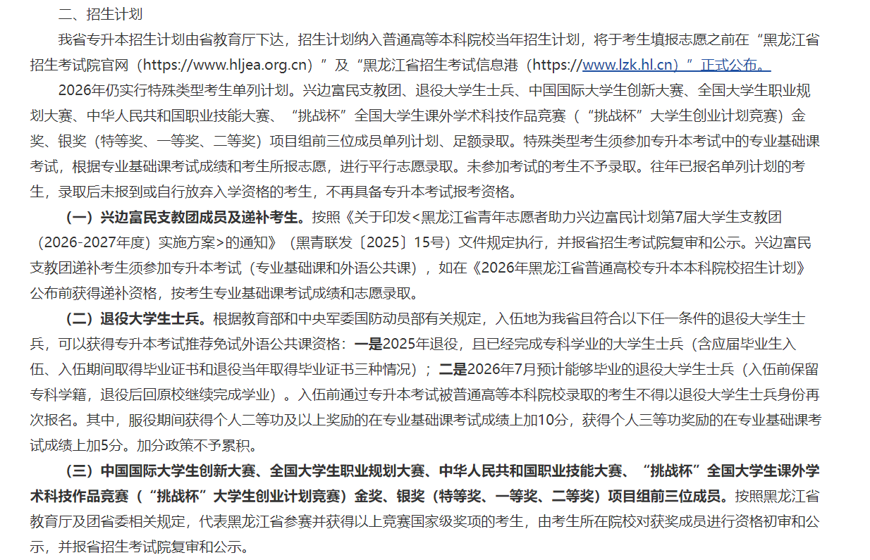 我省专升本招生计划由省教育厅下达,纳入普通高等本科院校当年招生计划,将于考生填报志愿之前在 “黑龙江省招生考试院官网(https://www.hljea.org.cn)” 及 “黑龙江省招生考试信息港(https://www.lzk.hl.cn)” 正式公布。2026 年仍实行特殊类型考生单列计划,兴边富民支教团、退役大学生士兵、中国国际大学生创新大赛等赛事获奖项目组前三位成员单列计划、足额录取。注意的是今天公告跟往年一个不一样的地方就是考生只能以退役大学生士兵身份报考一次。