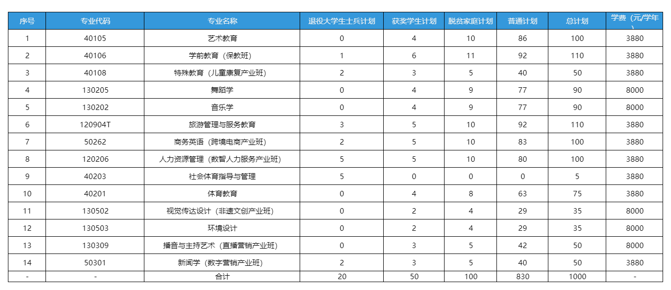 2025年豫章师范学院专升本合计招生1000人,覆盖14个本科专业,分专项计划与普通计划明细如下: