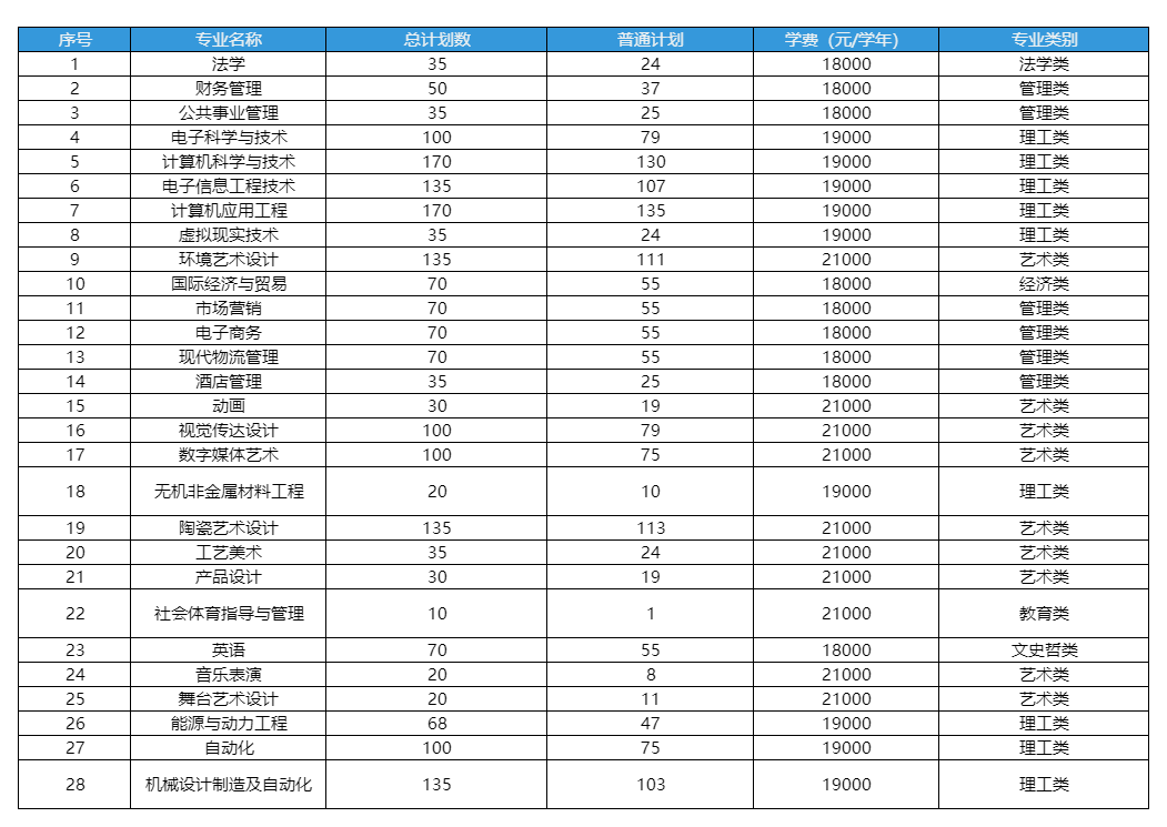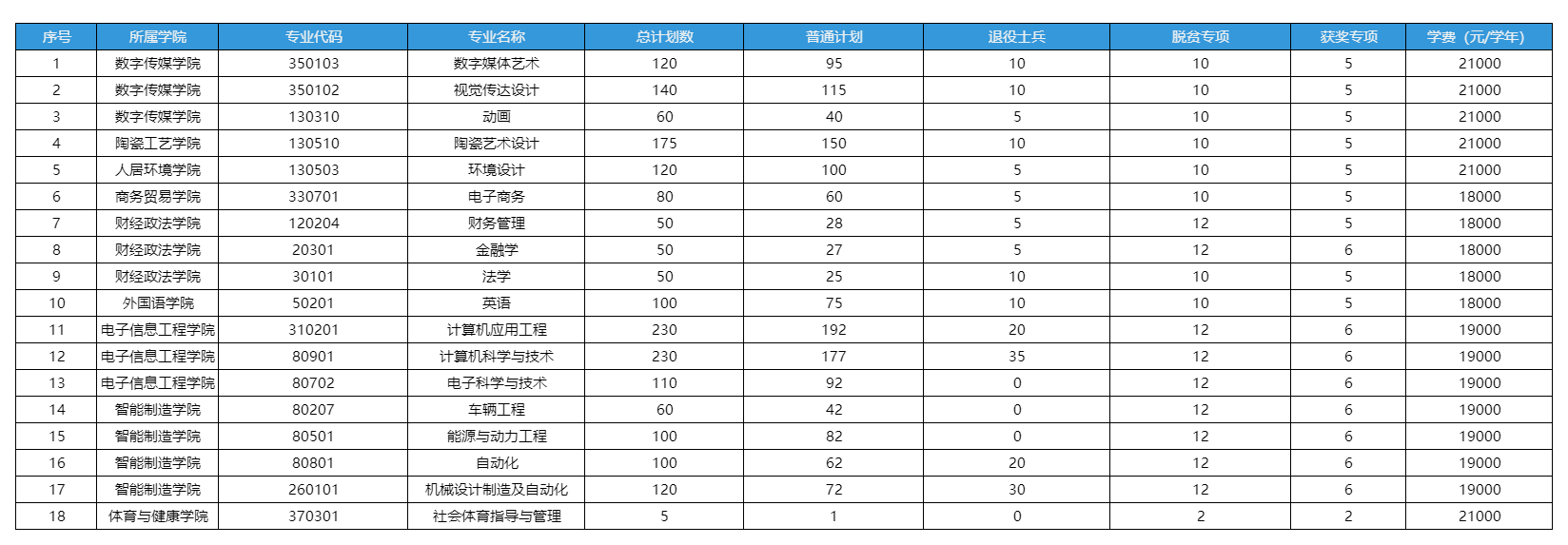 景德镇艺术职业大学2026年专升本总招生计划2053人,较2025年扩招153人,其中普通计划1556人、退役士兵计划190人、脱贫专项计划205人、获奖专项计划102人,覆盖28个本科专业,具体专业计划及学费如下: