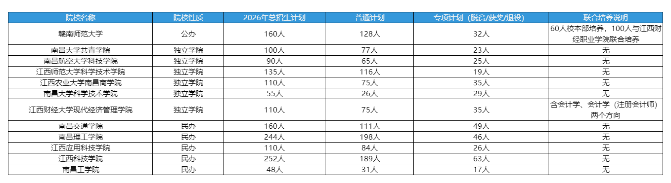 一、2026江西专升本会计专业招生院校及招生计划全汇总