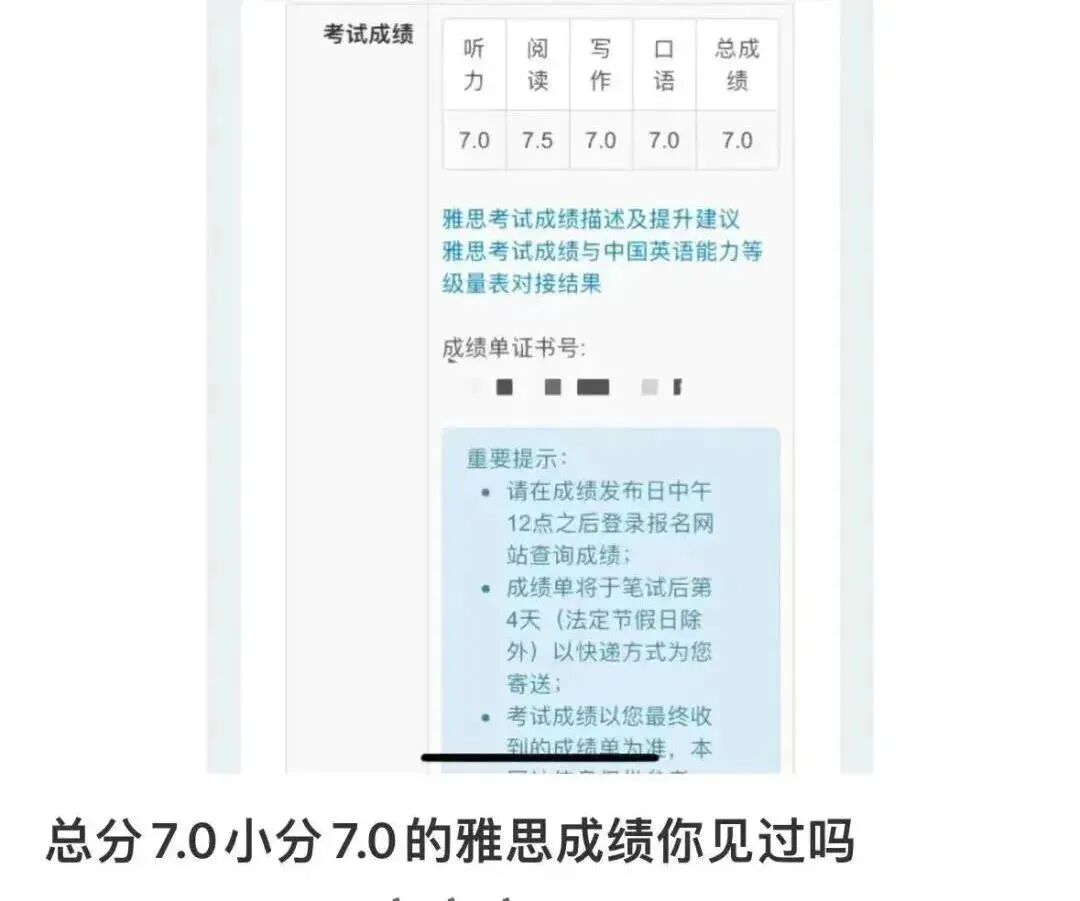 而听力&写作&口语都是7.0,阅读7.5,总分7分,则被评论区认为是“高配”7分,因为口写同时7分相当难。甚至有网友觉得这比听力8,阅读8,写作6.5,口语6.5还要牛!