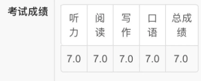 听说读写四个单科均达到7分或以上,这意味着同学在英语的综合运用能力上较为均衡,尤其在写作和口语这两个对中国考生来说难度较高的科目上也表现出色。