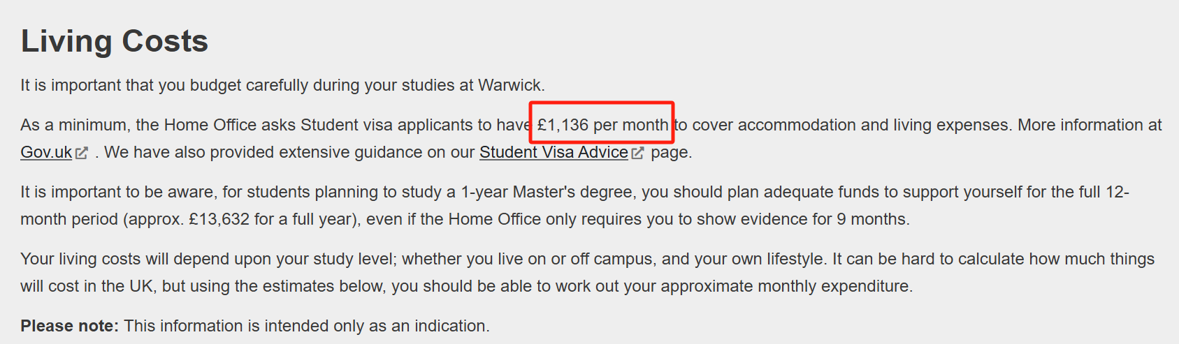 华威大学官网给出的国际生生活费参考为£1,136/月。