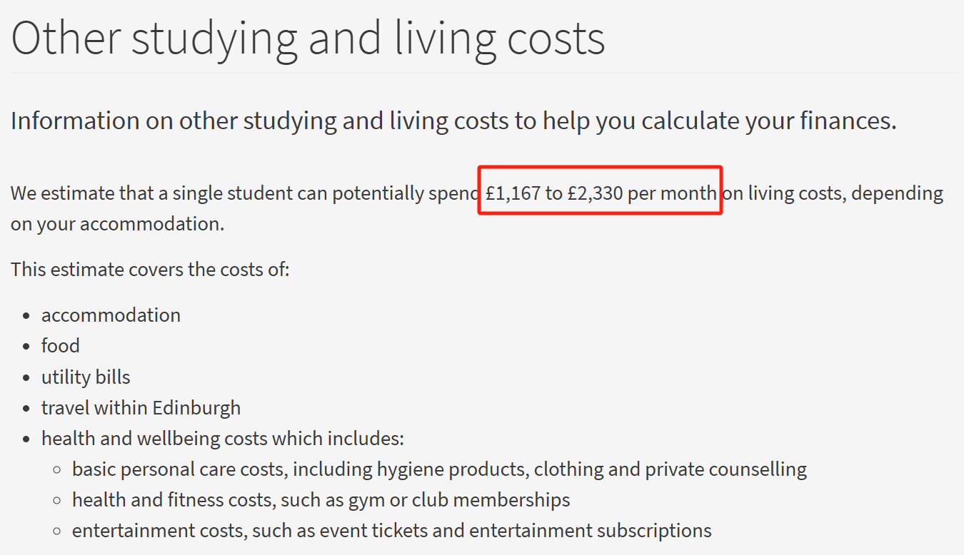 爱丁堡大学官网同样给出了生活费的参考范围,即£1,167 -£2,330/月: