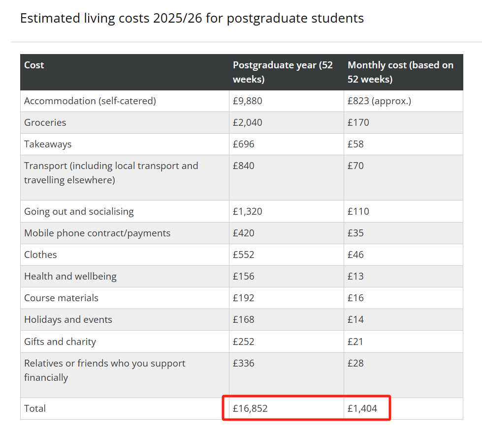 针对2025/26学年的生活费用,曼彻斯特大学提供的参考为£1,404/月: