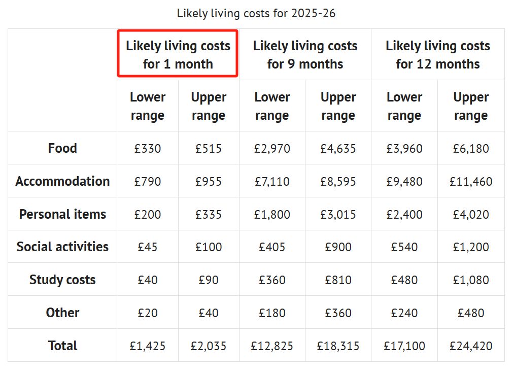 针对2025-26学年的生活费用,牛津大学提供的费用参考为£1,425-£2,035(每月):