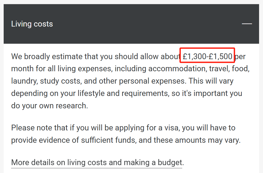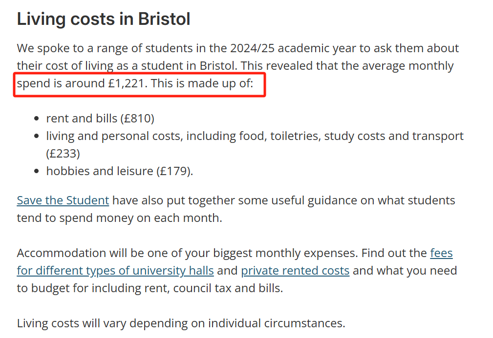 对于学生的生活费用,布大官网给出的参考是£1,221/月(涵盖住宿和个人花费):