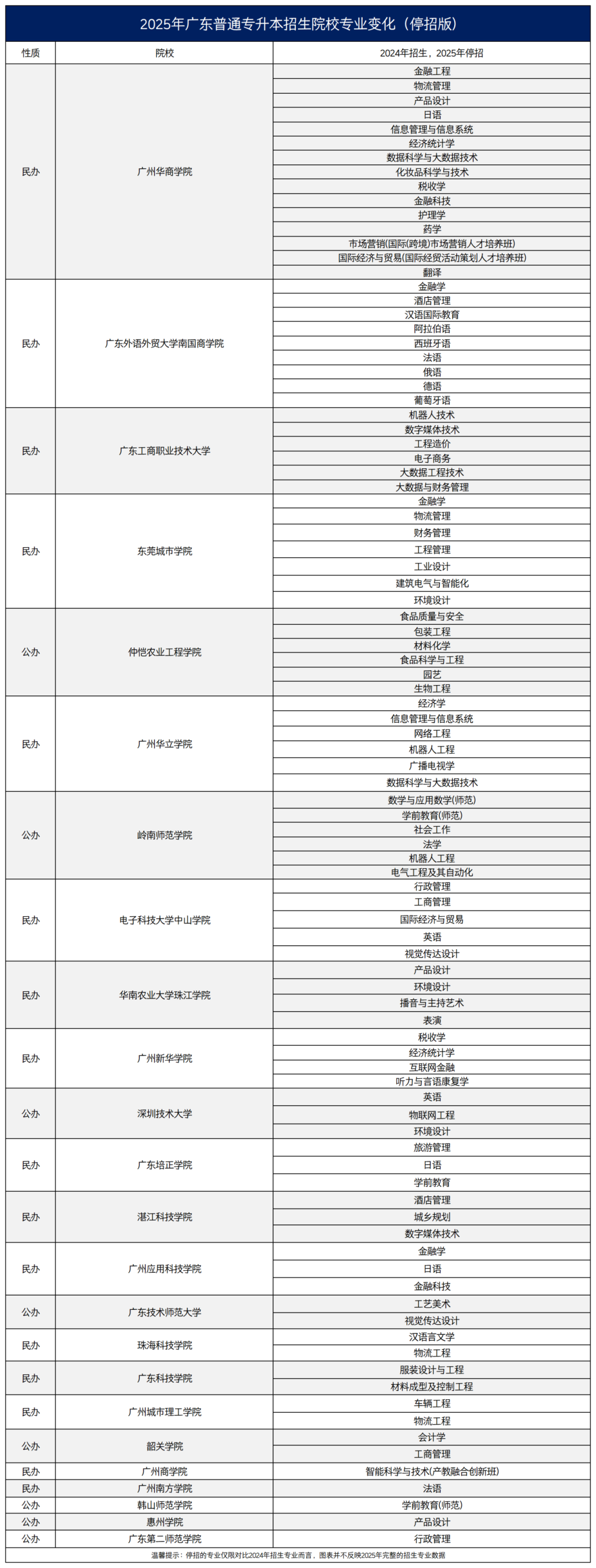 每一年的广东普通专升本考试招生院校专业不是固定不变的,虽然大致相同,但也要查看想要报考的院校今年是否招收这个专业,若有变动,则需赶紧调整报考计划。下面是2025年的变动情况。