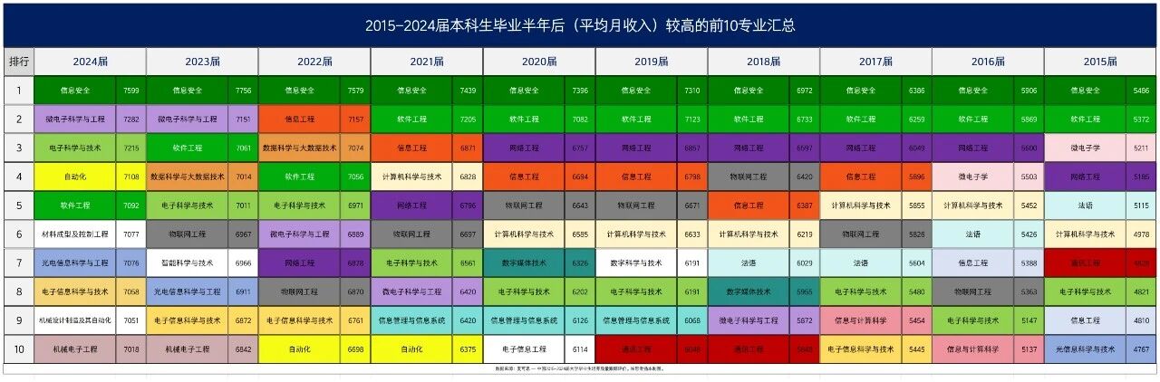 下图展示了近十年来本科毕业生就业情况较好的前十专业。可以看出信息安全、软件工程这两个专业是稳居前列了。