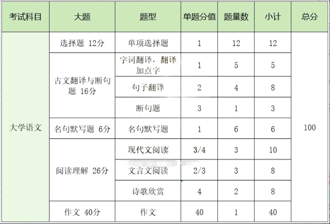 广东专升本语文考试题型有选择题12分,古文翻译与断句题16分,名句默写题6分,阅读理解26分,作文40分。名句默写题题型主要考察考生对经典文学作品的熟悉程度和对名句的记忆能力,拿分没有捷径,只在于平时的积累和背诵。