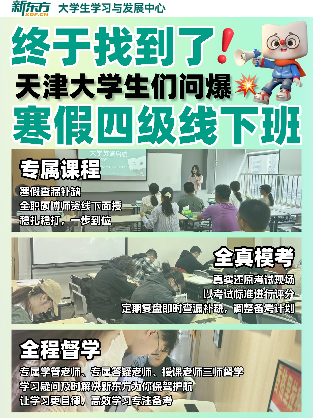 摘要: 本文面向备战大学英语四级考试的考生,推出"四级全面提升计划"寒假课程。课程采用面授+直播的混合教学模式,配备专属学习导师,通过系统化训练和个性化辅导,帮助考生在寒假期间有效提升英语能力。
