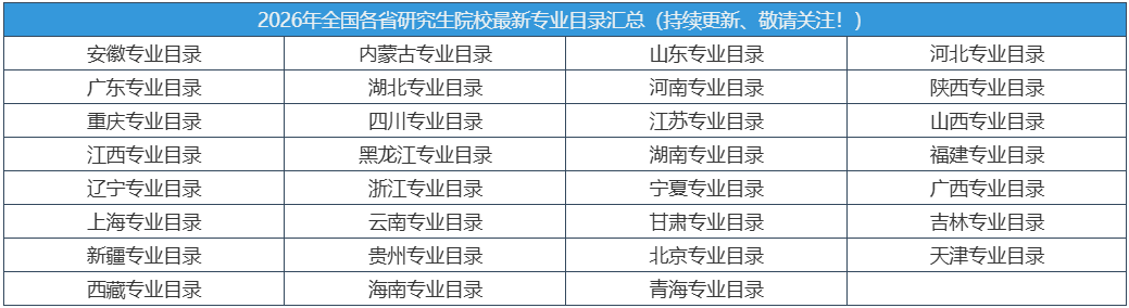 下面是由小编为您提供的部分内容,更多详细内容欢迎大家观看新东方考研官网,如有任何疑问,可联系客服老师咨询。随着2025年考研落下帷幕,2026年全国硕士研究生招生的备考工作已全面启动。本文为广大考生整理出“2026年全国各省研究生招生院校专业目录汇总”入口,旨在帮助备战2026年考研的同学,能够第一时间获取目标院校和专业的详细招考信息。