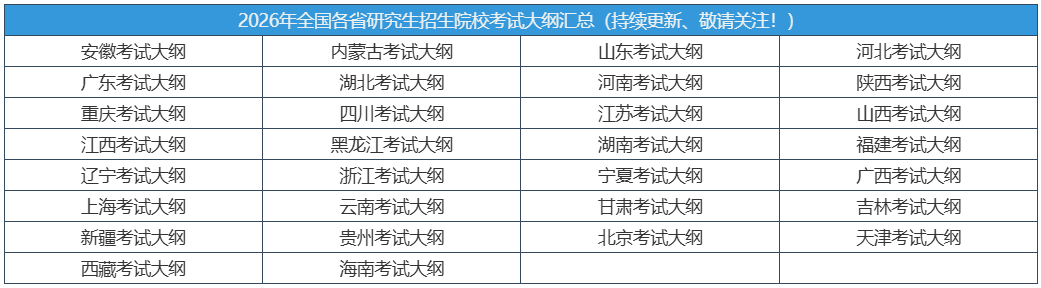 下面是由小编为您提供的部分内容,更多详细内容欢迎大家观看新东方考研官网,如有任何疑问,可联系客服老师咨询。随着2025年考研落下帷幕,2026年全国硕士研究生招生的备考工作已全面启动。本文为广大考生整理出2026年全国各省研究生招生院校考试大纲入口,旨在帮助备战2026年考研的同学,能够第一时间获取目标院校和专业的权威备考资料。