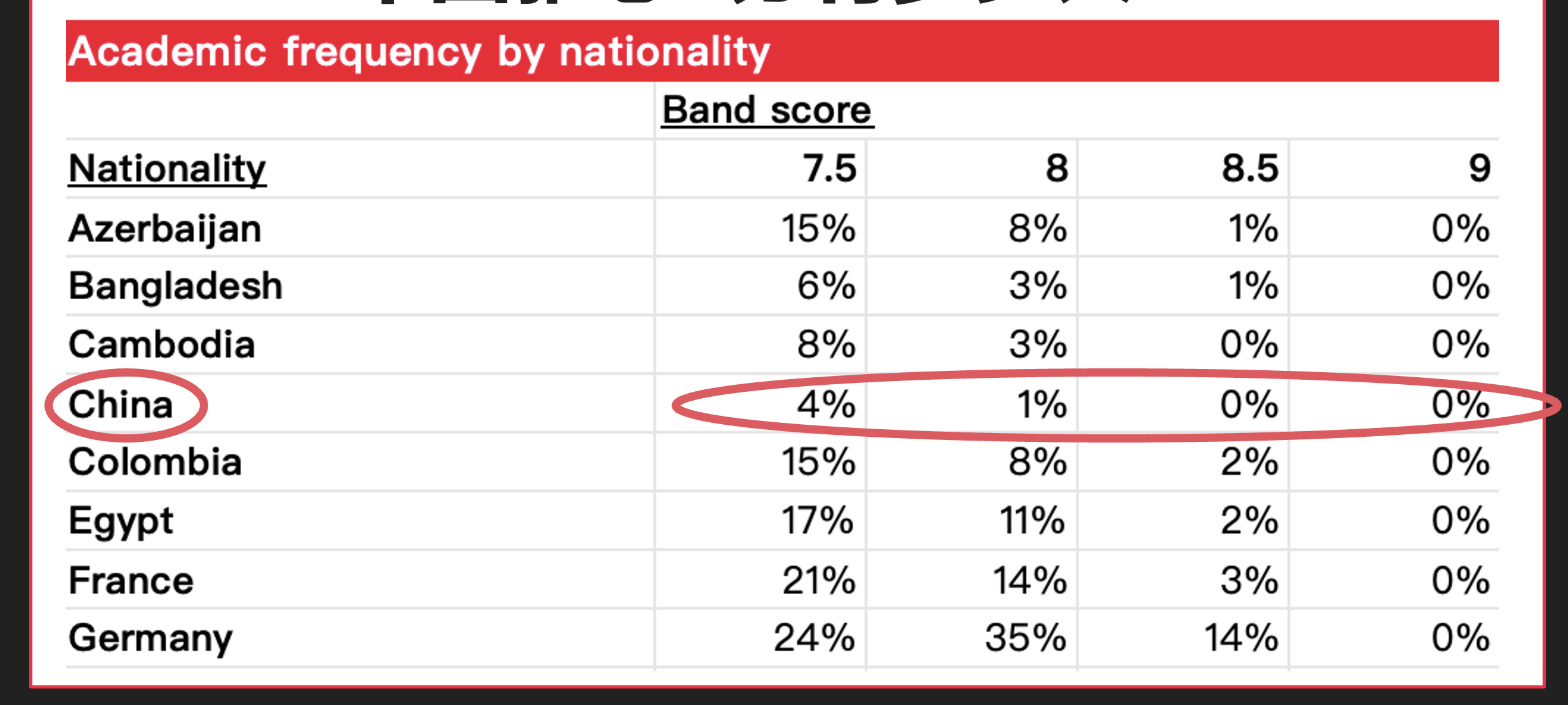 最戳心的一项数据是:中国国籍的考生,9分选手的比例是0%(无限接近于0)。