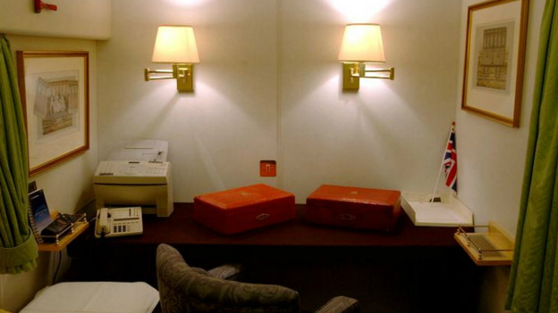 女王的办公室安装有现代的通讯设备,办公桌上摆着两个磨毛了边的红色文件盒。