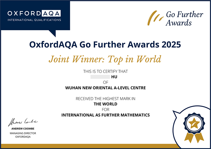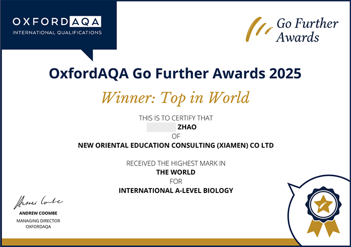 尤为重要的是,来自武汉新东方彼岸ICC国际课程中心的HU同学在牛津AQA 2025考季AS进阶数学科目上取得全球最高分,来自厦门新东方彼岸ICC国际课程中心的ZHAO同学在A Level生物科目上取得全球最高分。两位学子均获得Go Further Award学生成就奖-全球最高分的荣誉,武汉、厦门两所分中心也被牛津AQA官方授予学术成就奖,卓越的成绩再一次展示了新东方彼岸ICC国际课程中心的教学实力与学术培养能力。