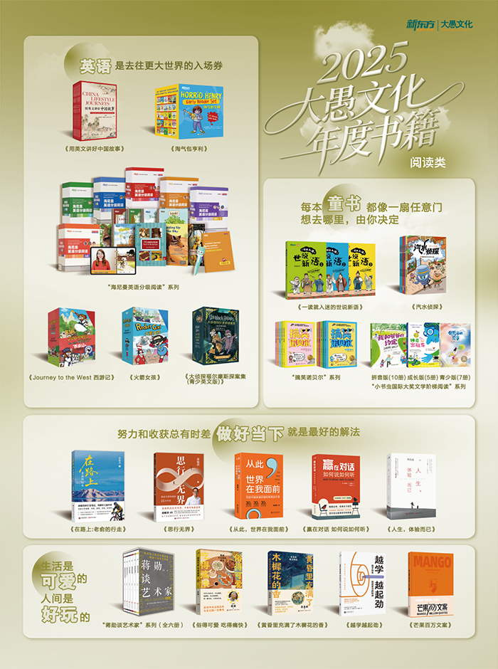 大愚文化的大众出版,始终带着新东方特有的人文温度。2025年,大愚与诸多思想者同行:《蒋勋谈艺术家》借艺术家的故事探讨美与孤独,作家蔡澜以《俗得可爱 吃得痛快》书写生活的真味,季羡林、冯骥才、刘亮程、李尚龙等不同代际的学者和作家,则以文字构筑起一座座精神灯塔。此外,新东方创始人俞敏洪在《在路上》中记录行走中的顿悟,新东方首席执行官周成刚于《从此,世界在我面前》呈现多元而真实的成长路径,他们以温和而坚定的声音,为这个时代提供了抵达远方的多元样本与内心坐标。