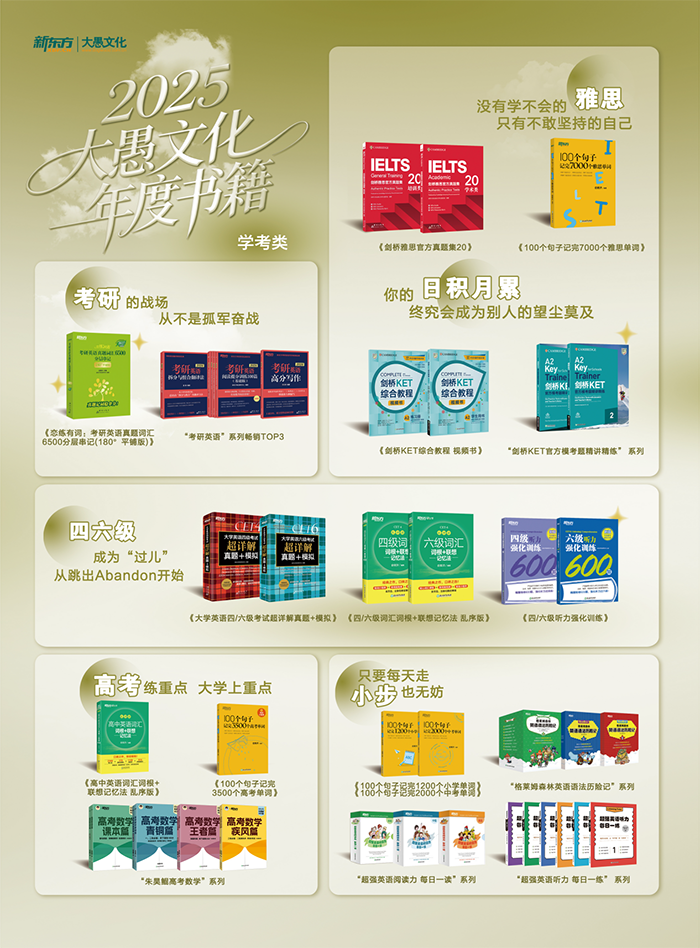 面对考研、四六级、中高考、雅思、托福、剑桥通用五级等纷繁考纲,大愚团队以新东方一线教学经验为基,将庞杂考点逐个拆解。“绿宝书”系列、“100个句子”系列早已成为无数学子书桌上的“老朋友”;而《考研英语题源报刊阅读》《高分写作素材大全》等新品,则直击“有输入无输出”“有模板无思想”的备考难点,推动学习从机械刷题迈向思维升级。“我们的每一道例题、每一个解题思路,都来自新东方课堂的真实教学沉淀。”大愚文化编辑团队表示,“这不是简单的教辅汇编,而是可复制的学习路径。”