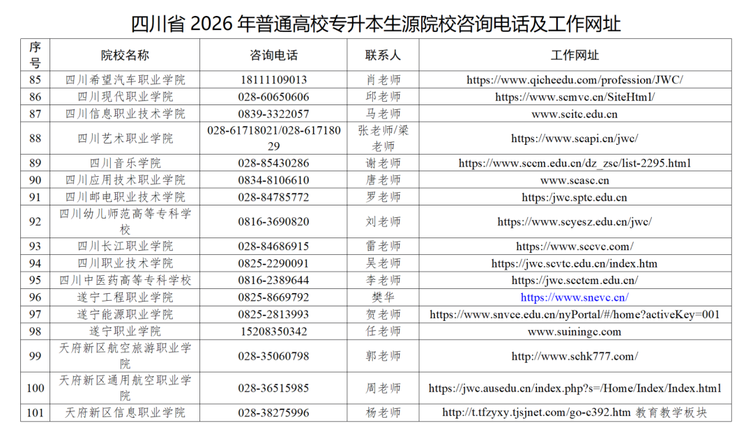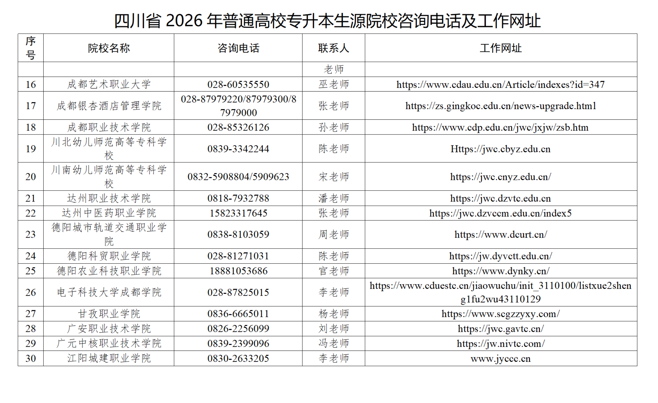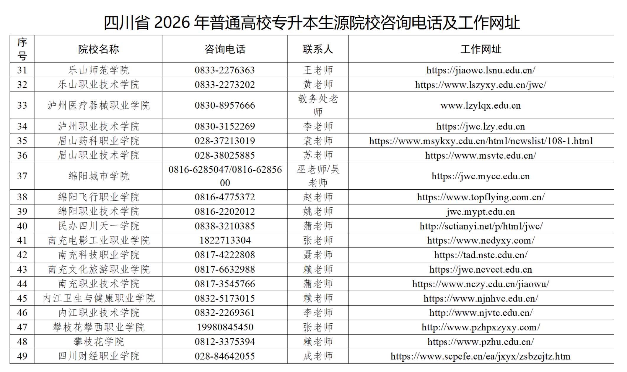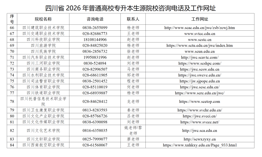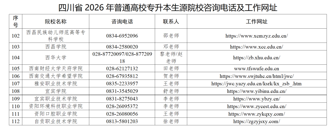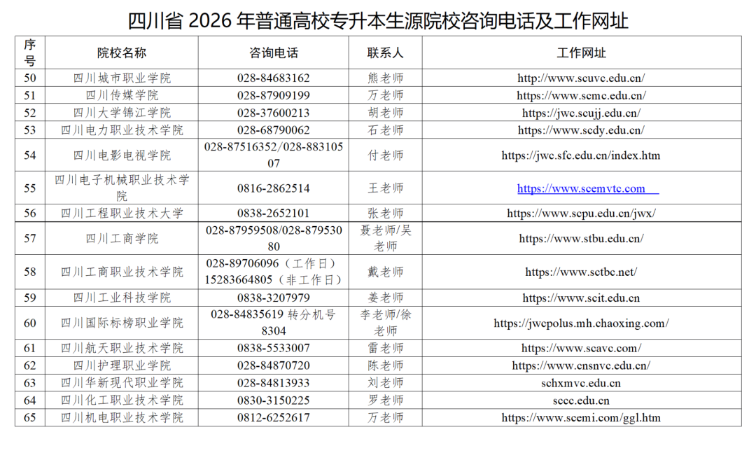 2026年四川省普通高校专升本生源院校咨询电话及工作网址如下: