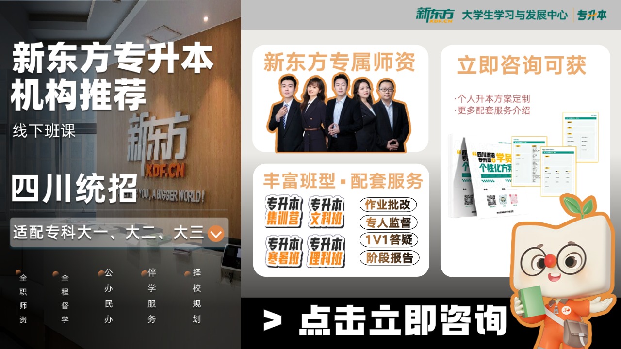 无论你是大二规划、大三冲刺,还是 0 基础、无规划的考生,成都新东方专升本都是靠谱之选!依托品牌口碑与硬核师资,搭配贴合四川考情的系统化课程,精准解决备考难点。不用费心搜集资料、纠结备考计划,这里全程为你护航!点击右下方弹窗咨询在线老师,领取个性化学习规划,解锁专属升本干货,助你高效上岸理想本科!四川新东方专升本(成都)客服微信:18613293072(加微信)