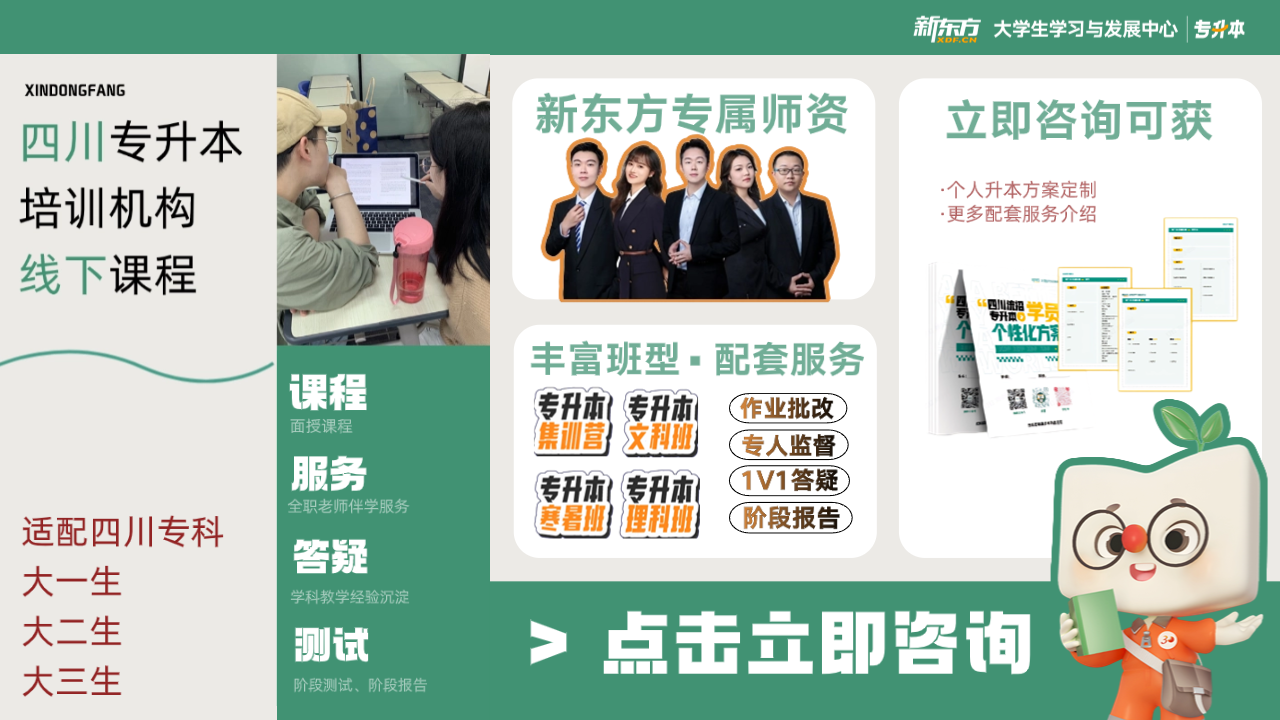 无论你是大二规划、大三冲刺,还是 0 基础、无规划的考生,成都新东方专升本都是靠谱之选!依托品牌口碑与硬核师资,搭配贴合四川考情的系统化课程,精准解决备考难点。不用费心搜集资料、纠结备考计划,这里全程为你护航!点击右下方弹窗咨询在线老师,领取个性化学习规划,解锁专属升本干货,助你高效上岸理想本科!四川新东方专升本(成都)客服微信:18613293072(加微信)