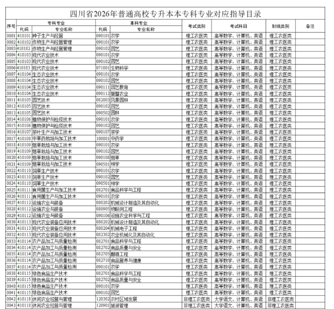 四川省2026年普通高校专升本本专科专业对应指导目录