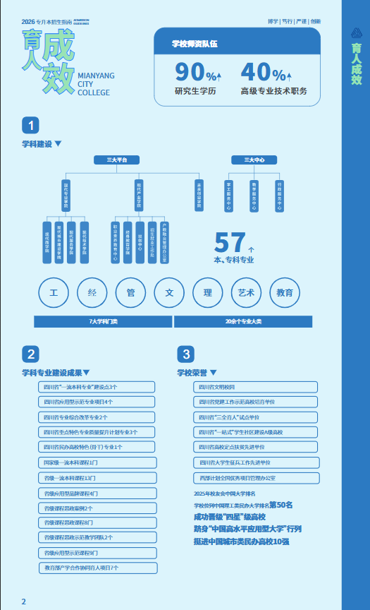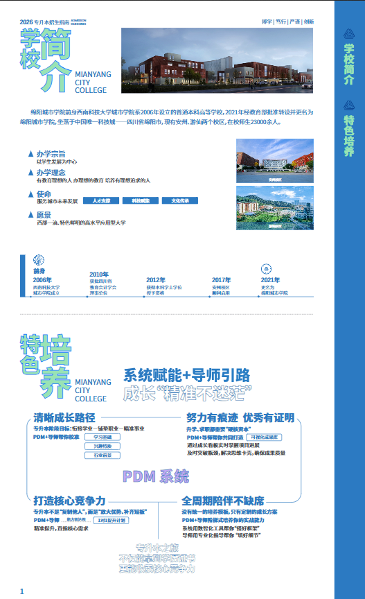 本次专升本招生延续 “应用型人才培养” 定位,面向普通高职(专科)应届毕业生、退役大学生士兵等群体开放招生,提供单列计划录取、免试入学等多元政策支持,搭配学业导师制、考研专项帮扶、奖助体系等全方位保障绵阳城市学院教务处,为考生搭建从专科到本科的高质量升学桥梁,助力实现学业进阶与职业发展的双重突破。招生指南具体内容如下: