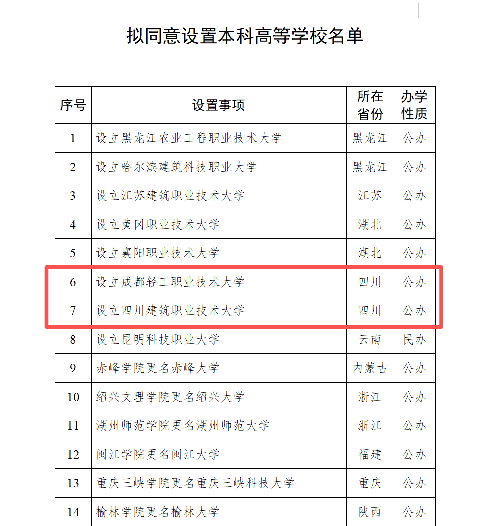 依据《中华人民共和国高等教育法》相关规定,教育部经党组会议审议后对外发布公示,拟同意设置14所本科高等学校,公示期为2026年1月12日至1月16日。其中,四川省有两所公办本科层次职业学校榜上有名,分别是"成都轻工职业技术大学"与"四川建筑职业技术大学"。