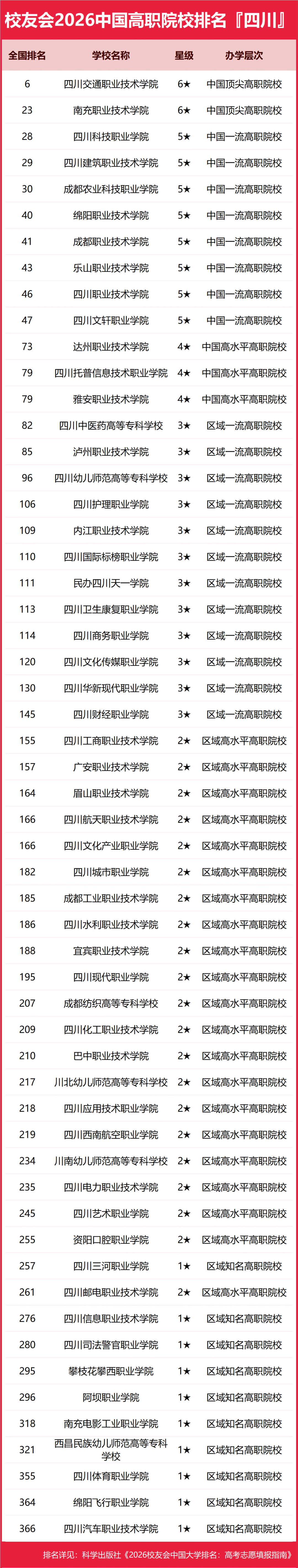 在校友会2026中国高职院校排名中,四川交通职业技术学院全国排名第6名,居于2026四川省高职院校排名第一。南充职业技术学院第2名,四川科技职业学院第3名。