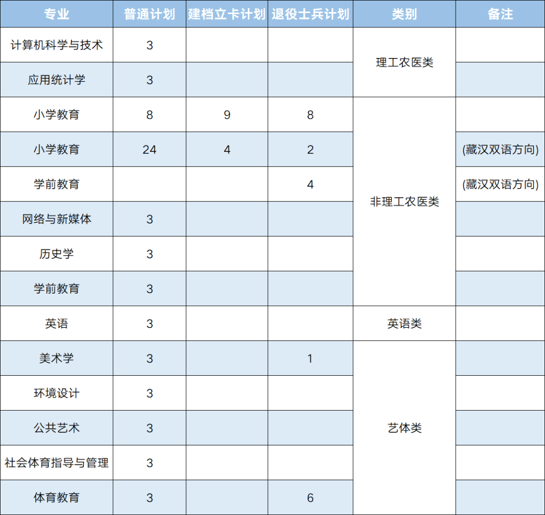 阿坝师范学院25年共有14个专业招生,招生计划100人。普通考生:65人、建档立卡考生:13人、退役大学生士兵:22人。其中, 普通类招生中人数最多的专业为小学教育,计划人数24人。学前教育无招生计划。具体情况如下: