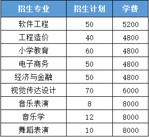 根据内江师范学院2025年专升本招生简章,计划招生9个专业,学制均为2年。 其中,工程造价,小学教育,电子商务,经济与金融专业统一为4800元/年;软件工程专业,学费5200元/年;视觉传达设计专业,学费6000元/年;音乐表演,音乐学,舞蹈表演等艺术向专业,学费8000元/年。