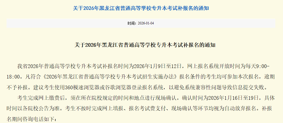 2026 年黑龙江专升本补报名于 1 月 9 日正式启动,截至 1 月 12 日,每天 9:00-18:00 开放网上报名系统,逾期不再受理补报,符合报名条件的考生请及时完成报名全流程,哈尔滨新东方专升本可提供报名流程与材料核对指导服务黑龙江省招生考试院。