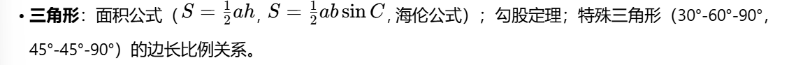 圆:周长与面积公式;垂径定理;圆周角定理。