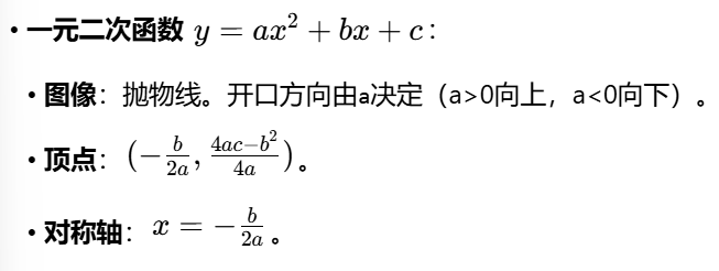 •一元二次方程:求根公式、判别式(Δ = b² - 4ac)、韦达定理(根与系数的关系)是基础。
