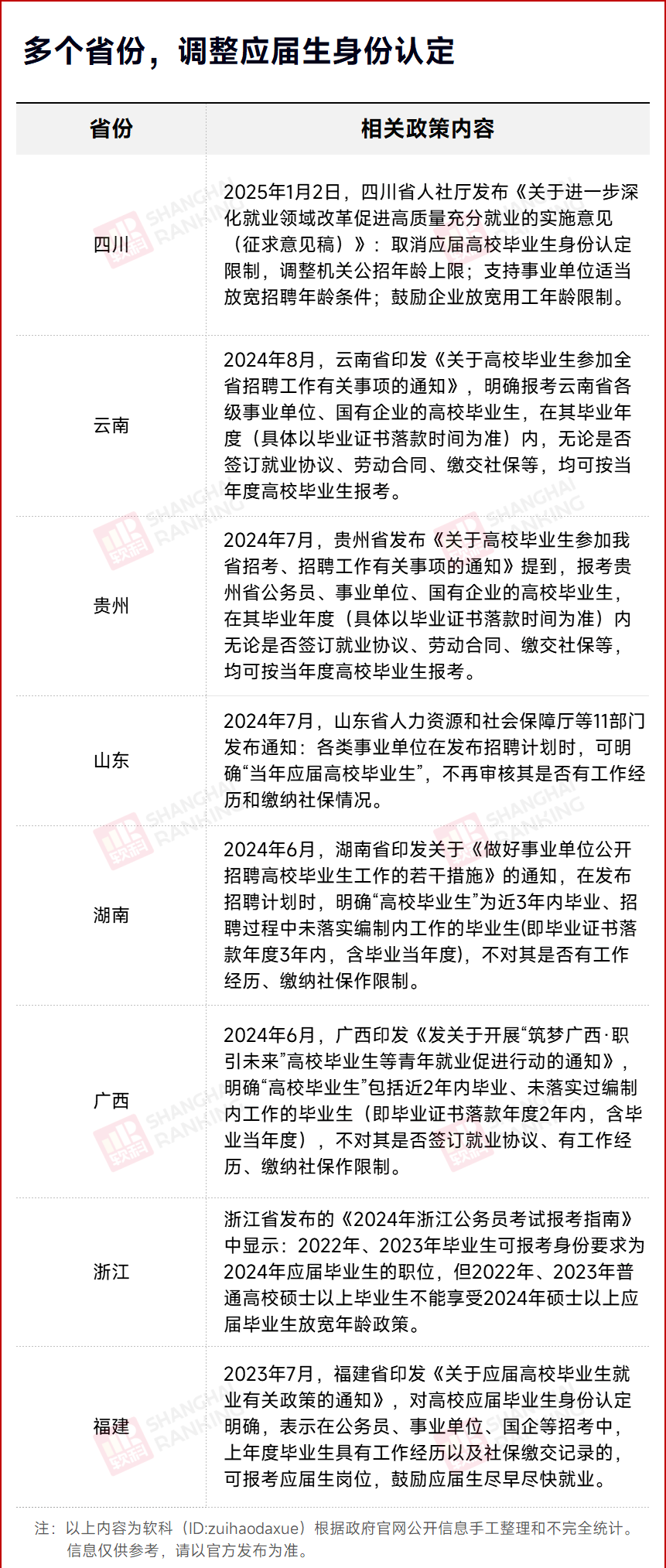 除此之外,上海、山东、湖南、贵州、广西等多个省份的事业单位招考中,不再审核考生是否有工作经历和缴纳社保的情况。
