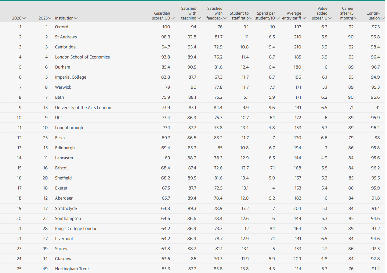 本次排名,牛津大学以100分的满分成绩,蝉联《卫报》榜单前茅的位置,圣安德鲁斯大学和剑桥大学分列第2、第3; 伦敦政治经济学院位列第4。