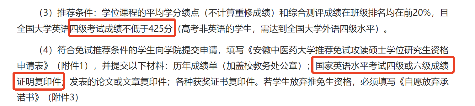 (4)符合免试推荐条件的学生向学院提交申请,填写《安徽中医药大学推荐免试攻读硕士学位研究生资格申请表》(附件1),并提交以下材料:历年成绩单(加盖校教务处公章);国家英语水平考试四级或六级成绩证明复印件;发表的论文或文章复印件;各种获奖证书复印件。若学生放弃推免生资格,必须填写《自愿放弃承诺书》(附件3)