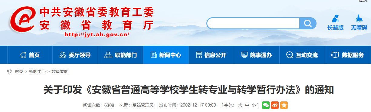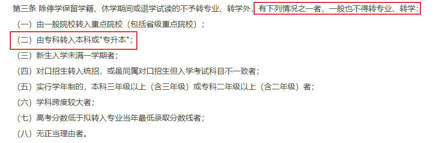 省教育厅早在2002年印发《安徽省普通高等学校学生转专业与转学暂行办法》(该文件已废止)通知一文中明确提及“由专科转入本科或专升本一般不得转专业、转学”