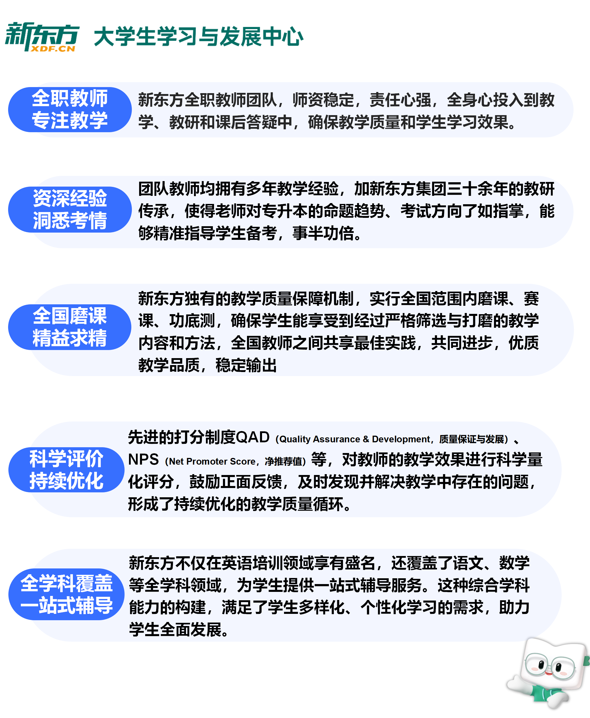 【安徽新东方专升本】新东方教师天团,全硕士学历,全职专注、经验深厚,集团实行全国磨课的高标准,结合科学严谨的评价体系和全面的学科规划,构建了一套高效、优质的教育服务体系。全职教师团队不仅是新东方教育科技集团三十余年深厚积淀的结晶,更是其致力于教育创新与卓越的明证。