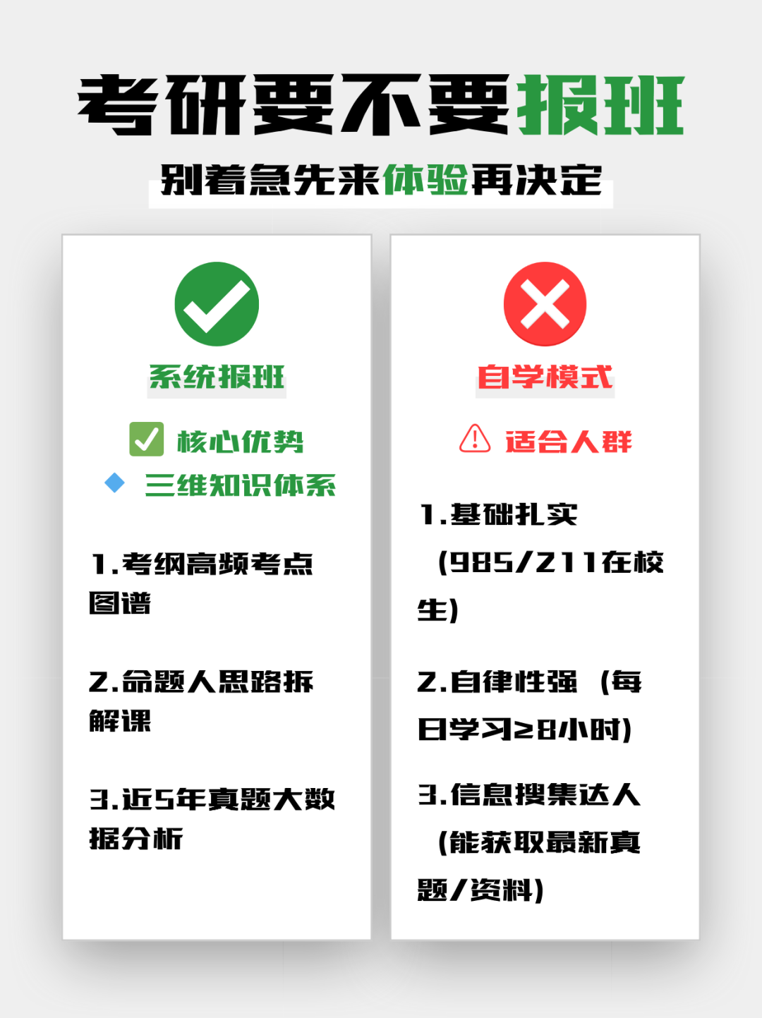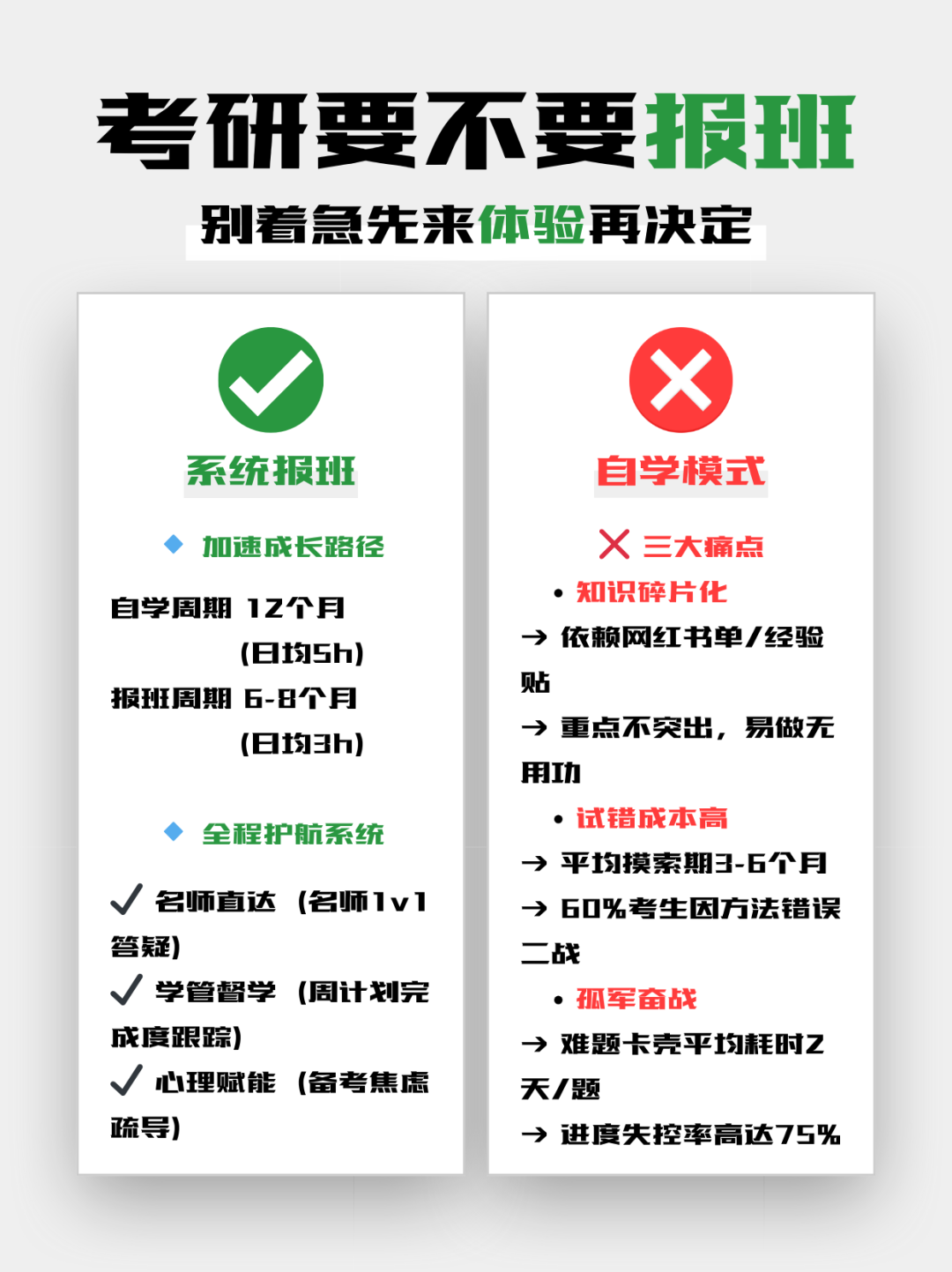 周期长:自学计划缺少重点,别人说哪本资料你就赶紧跟着买,看了多少是有点帮助,但无法立竿见影,每个人的资源和时间都有限,盲目开始=浪费时间。