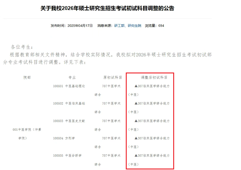 科目调整提前公布:多所院校已陆续发布2026考研科目变更通知,如哈尔滨工程大学(科目调整公告)、河南中医药大学(调整详情)等,较往年更早释放信号,方便考生提前规划。